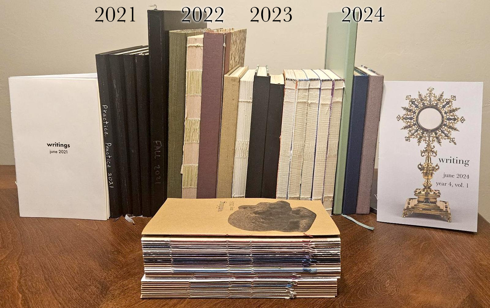 I've changed in the process. I left a relationship, took a break from San Diego, moved back to live alone for the first time, and entered a new relationship. I started seeing a therapist, switched to a different therapist, and experimented with saffron, St. John's wort, and California poppy. I learned how to bind books (seen in the photo going from 2021 to 2022), began running binding workshops in San Diego, was noticed by the library and invited to share bookbinding with the public. I worked at a book store, learned to make pottery, and began tutoring math and giving music lessons from my home. I started Meetups founding the San Diego Experimental Writing Group in 2022 followed by the Aesthetic Development Group in 2024 to bring people together in creative community, and ran several paid 8-week writing workshops focused on creative process.